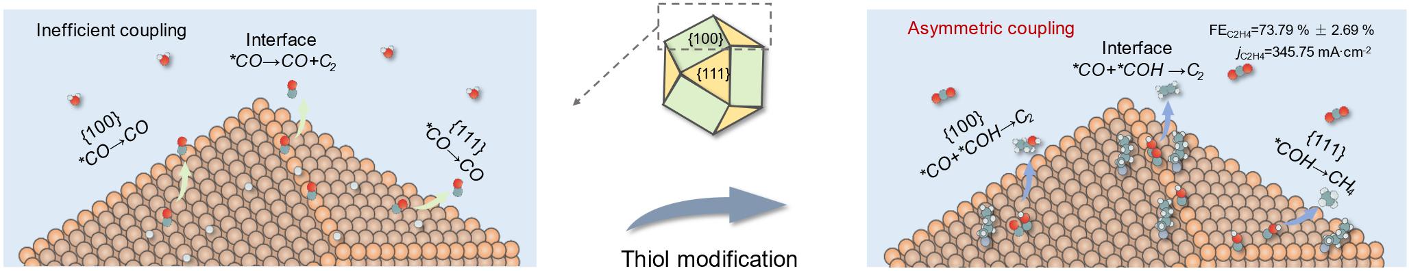 针对这一问题,本研究通过硫醇分子定制电化学界面,并综合运用多种先进表征与理论模拟方法,系统分析了不同晶面/界面的局部微环境,从而揭示了硫醇促进CC偶联的作用机制。本工作的创新性与重要意义总结如下: